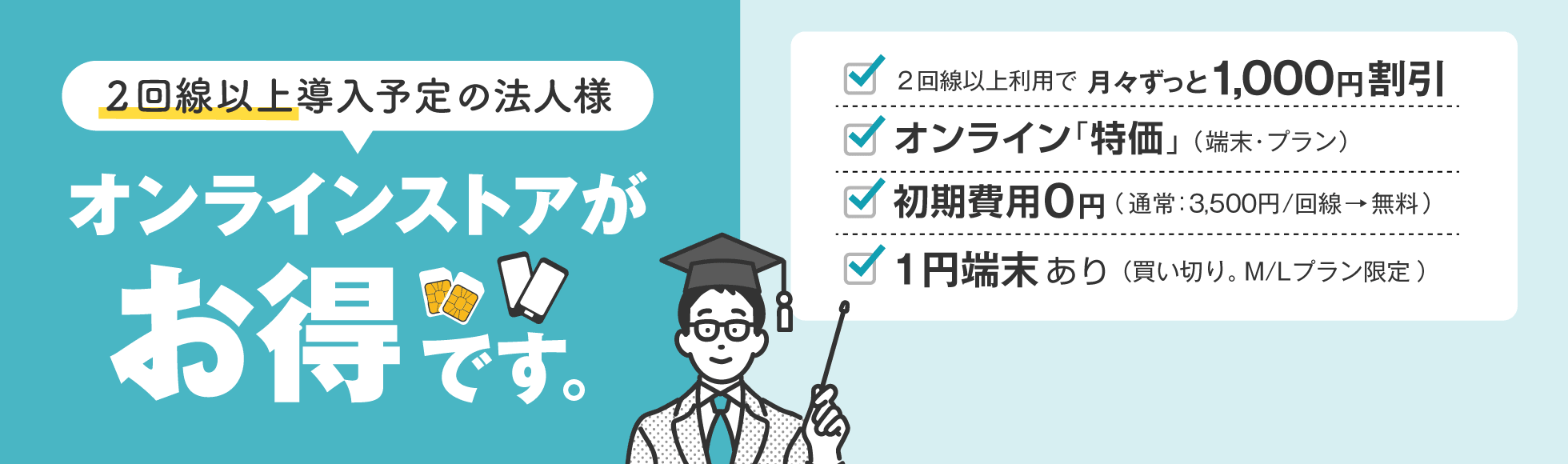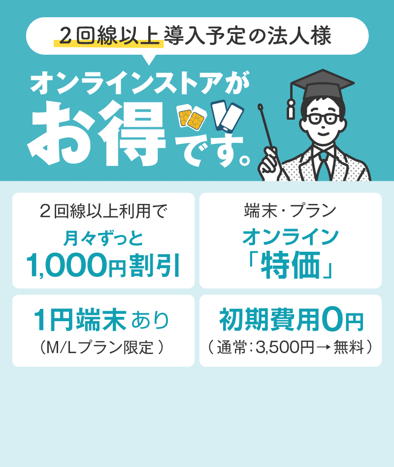 個人事業向け回線から大規模導入まで対応。オンラインストアなら回線毎の割引適用により導入数が多いほどお得度もアップ!