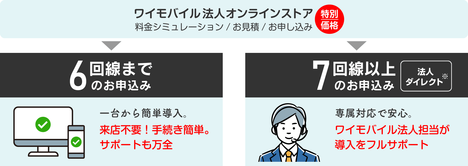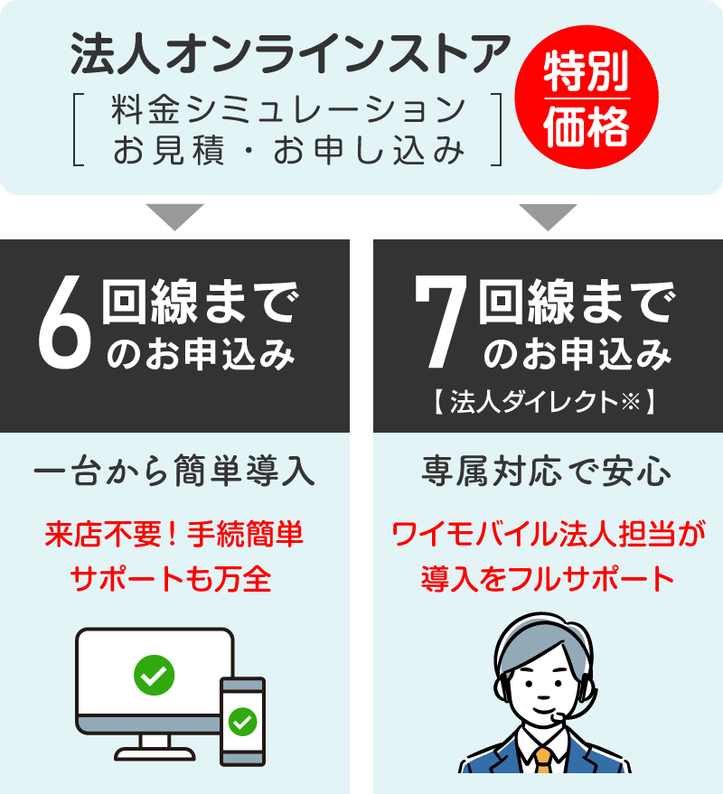 7回線以上お申込みの場合、貴社のお手続きを専属でサポートするワイモバイルの法人ダイレクト担当営業が応対いたします。